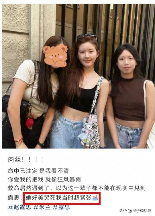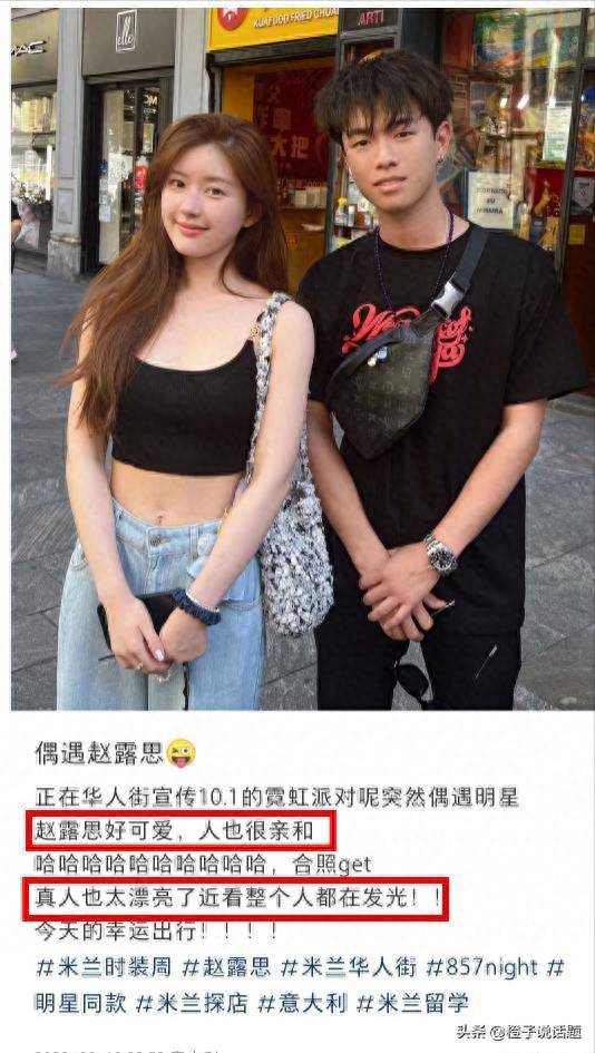 據一位IP地址位于意大利的網友分享,他在華人街偶遇到了趙露思,并曬出了兩人的合影。他高度贊揚趙露思:「趙露思好可愛,人也很親和,真人也太漂亮了,近看整個人都在發光。」這位網友的評價顯示出他對趙露思的喜愛和敬佩。